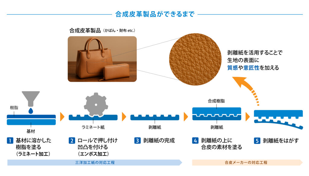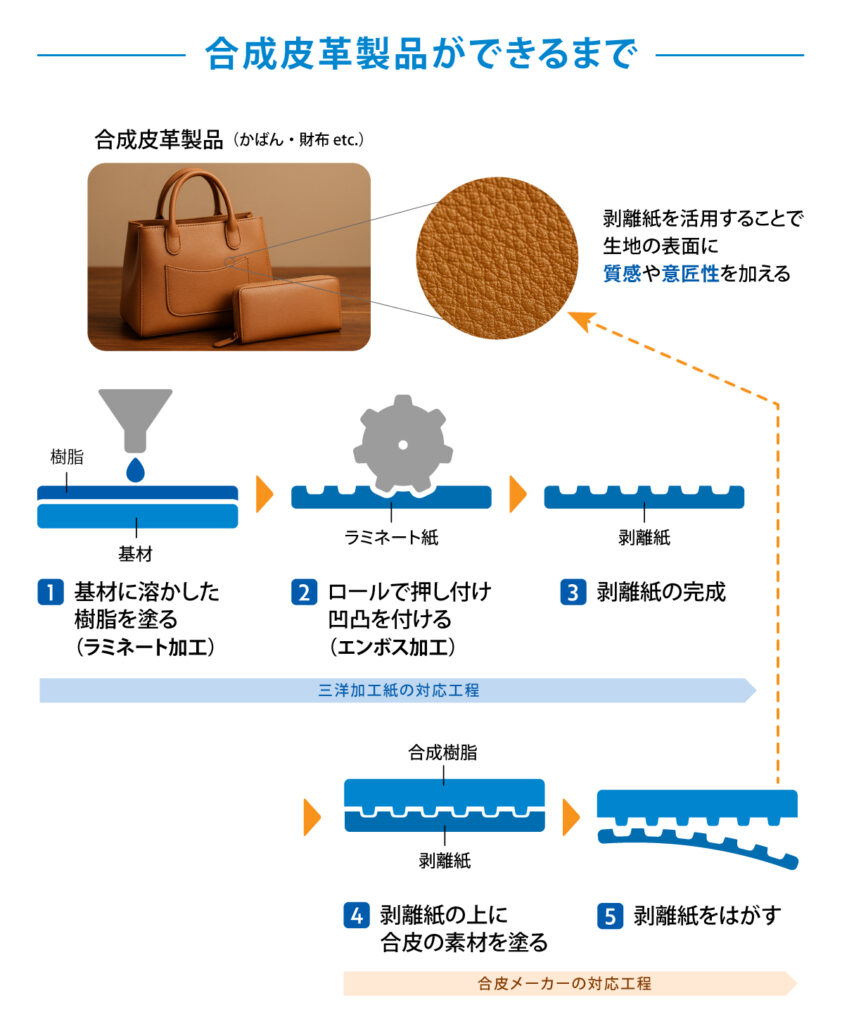 当社では押出ラミネートで製造したラミネート紙にエンボス加工を施し、合成皮革に使用される剥離紙として納品します。
