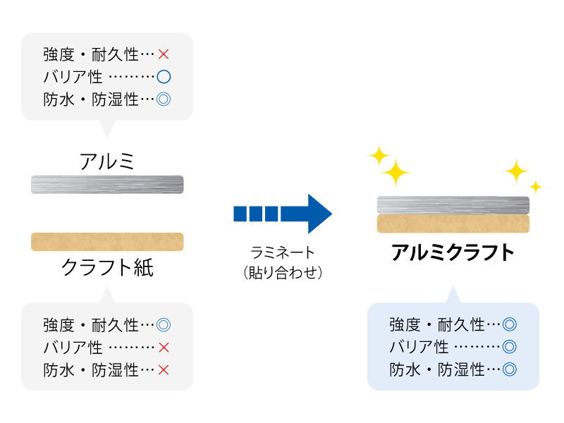 例えば、クラフト紙単体では水に弱くても、上からアルミを貼ることで防水性を高めることができます。逆にアルミだけでは強度が弱く破れやすいため、貼り合わせることにより両者の弱点を補い合った製品を生み出すことができるのです。これがラミネートの最大のメリットです。